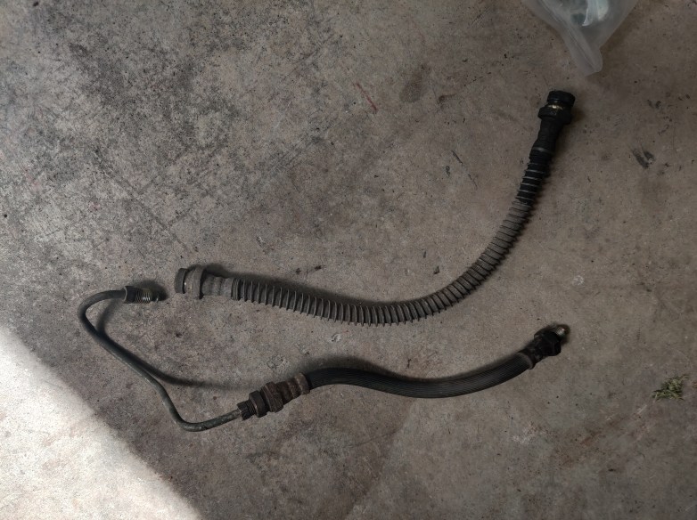 A little sidenote about the brake lines that someone engineer cooked up in the late 80s at Mitsubishi. At each wheel, the eclipse has not one brake line, but 3 at each front and 2 at each back. They appear to employ a design where one soft line section goes form the wheel arch to the suspension, which is responsible for accommodating suspension travel. Then, it either meets another soft line at a bracket (rear), or it joins a short section of hard line (front) before connecting to another soft line. This lower section is then only responsible for accommodating the motion of the wheel turning (in the case of the front wheels). Why this was chosen over a single line that would flex as necessary under both turning and suspension travel, I have no clue, perhaps it has to do with where the line meets the caliper? I can say that after plenty of research, I found that Mitsubishi abandoned these brakes entirely just as fast as they abandoned the pop-up headlights.