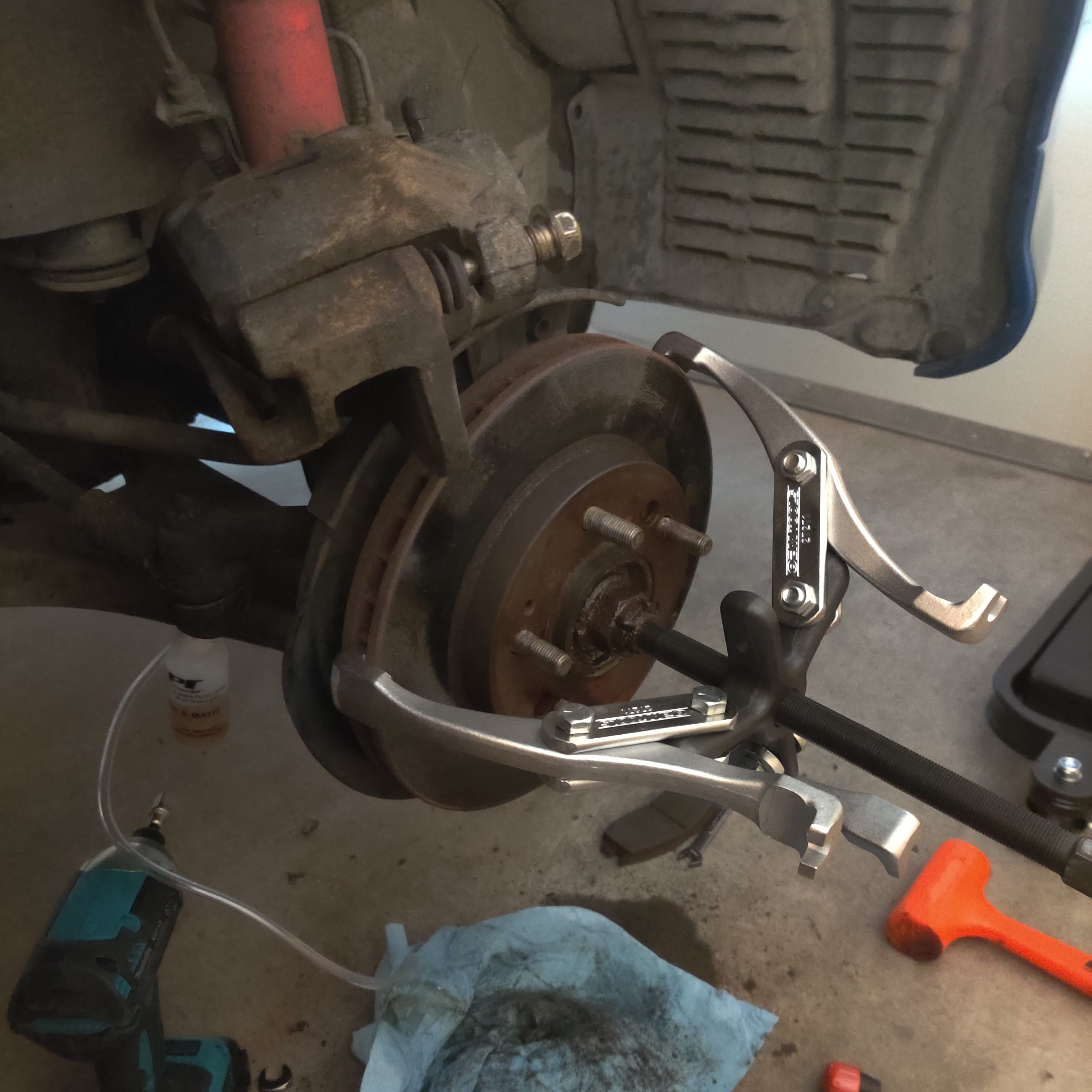 When I first got the car in the air, I immediately began pulling the front brakes off. A task I’ve done a good many times by now, I was prepared to have the car ready for new parts in a single afternoon. What I wasn’t prepared for, was just how bad the rotors had warped from the heat of that drive home. Now, both front rotors were firmly seized onto their hubs with an unfathomable pressure due to them losing their shape. Fortunately, the nearest auto parts store had a massive pulley extractor they were willing to let me borrow. Unfortunately even with this, I wouldn’t be able to muscle up the torque to break the rotor free.
